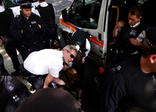 The woman was seen to be talking to two uniformed policemen in the foyer of ULU with a group of other activists. Shortly after that, she was seen to be pinned down on the floor by two policemen and arrested, screaming from the pressure exerted on her. She was dragged out of the building by two policemen while her friend was forcibly restrained. In the struggle, several tables were up-ended as police fought to keep a grip on the man, threatening to charge him with breach of the peace as he told them repeatedly to “Fuck off.”
