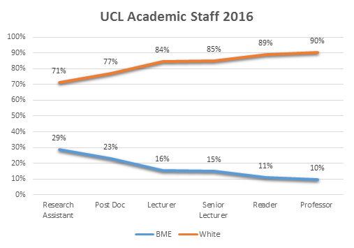 The proportion of BME and white UCL academic staff by seniority as of 2016. From the UCL Advancing Race Equality Toolkit (2018)
